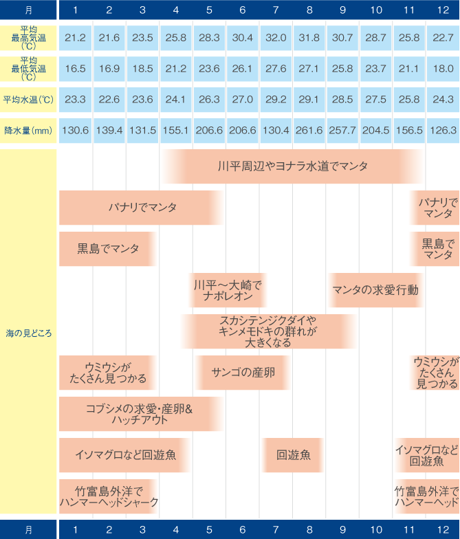 一年を通してダイビングができるが、特に梅雨明け後の夏から秋にかけて(ただし台風シーズンでもあるので、その場合を除く)がベストシーズン。冬場でも風に強いスポットでは潜れるのも強み。