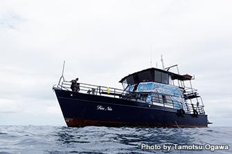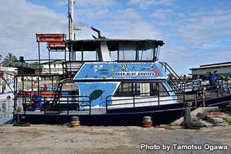 港に停泊している《ディープブルーダイビング・トンガ》の「キウニア」号。屋根が付いているので、ウオッチングのみのゲストにも人気