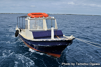 《ディープブルーダイビング・トンガ》の場合、ホエールスイムツアーは母船がテンダーボートを引っ張って出かける。