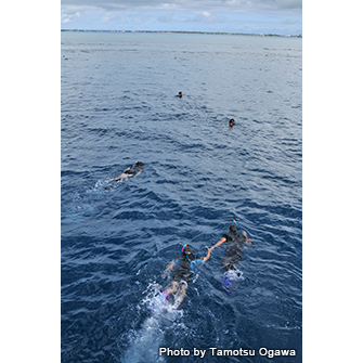フィン、マスク、スノーケルの「3点セット」を着けてデッキに座り、「GO!」がかかったら、できるだけ水面に衝撃を与えないよう、そろりと入り、泳いでいく。