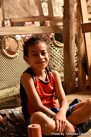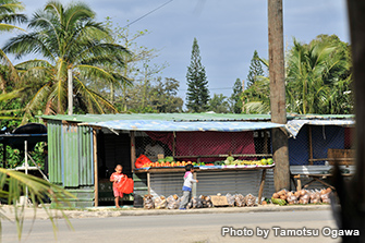 果物や飲み物がズラリと並べられたバラック造りのお店。いかにも南の島といった雰囲気。タロイモの袋詰めがハンパではない……