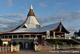 とんがった屋根が特徴的な、ヌクアロファの中心地にあるバシリカ教会。1階はレストランや土産店もある