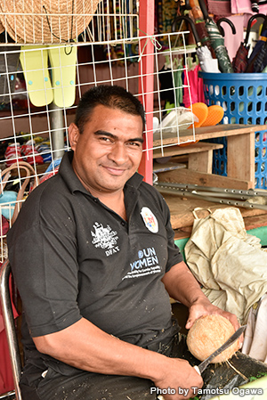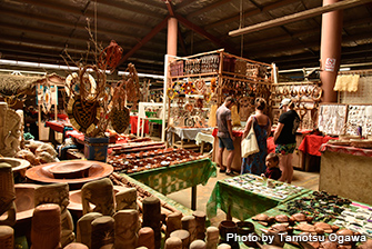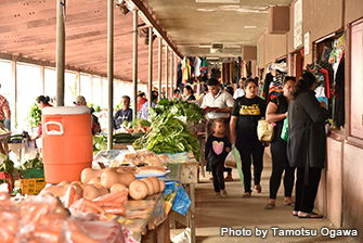 ヌクアロファの中心地にあるタラマフマーケット。トンガ人の胃袋を押さえる食料のほか、土産店などもあり、観光客にも人気。貝殻のアクセサリーなどもあるので、チェックしてみては