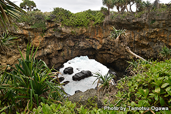 フファンガルペのナチュラルアーチ。トンガの言葉で「鳩の門」を意味ように、小さなアーチが海へと続いている