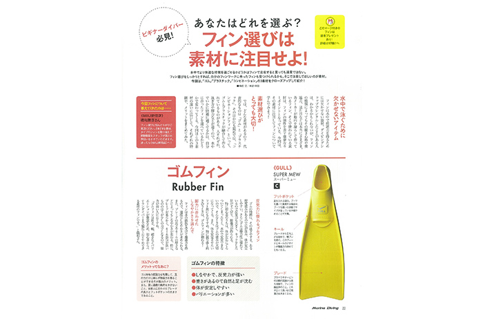 水中でラク~に泳ぐのに必須のアイテム、フィンを大研究。ゴム、プラスチック、そしてゴム&プラスチックの複合素材のメリットや特徴を詳しく紹介。各素材のオススメのフィンもラインナップしているので、初めてフィンを購入する方はもちろん、2本目、3本目のフィンを購入予定の方も必見だ!