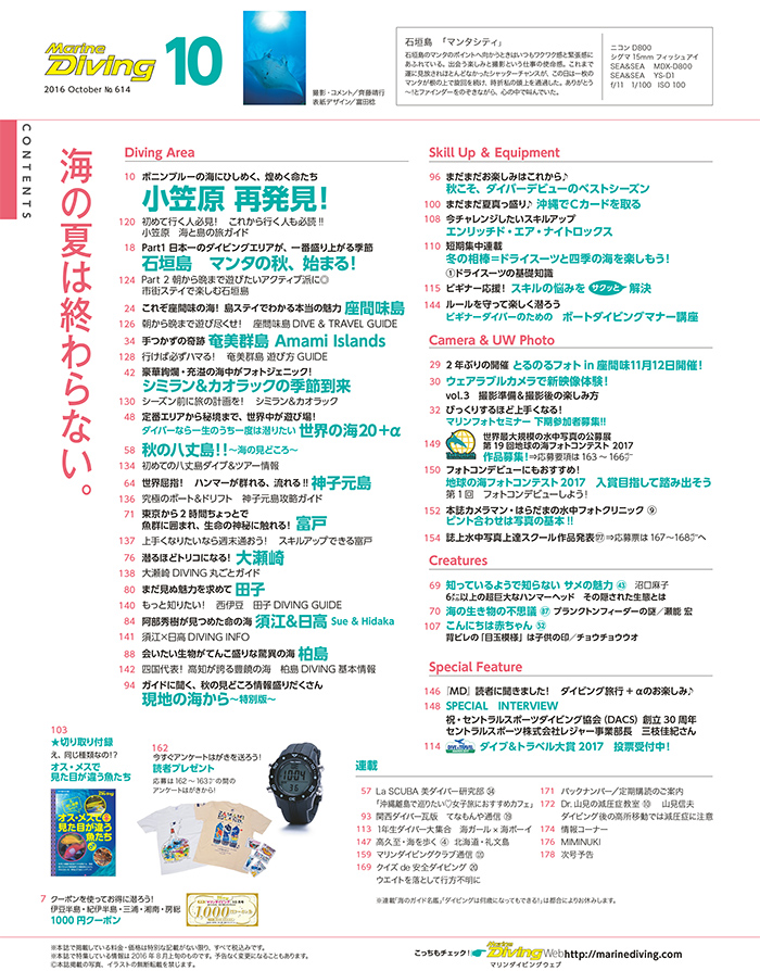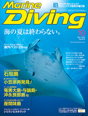 ほかにもベストシーズン突入の八丈島、ハンマーリバーの季節到来!神子元島、首都圏から2時間で行ける富戸や、西伊豆・大瀬崎、田子、そして紀伊半島の須江&日高、四国の雄、柏島などなどオススメしたい日本の海がズラリ。今から準備したいドライスーツのためになる話や、ダイビングのトラブル対処法など、