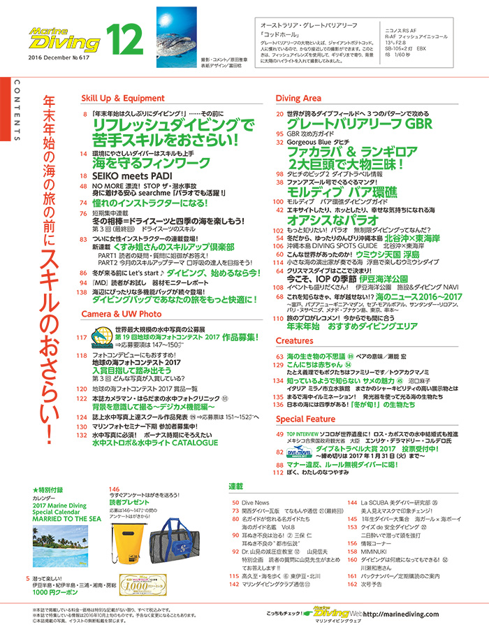 このほか、石川肇フォトグラファーが撮影してきたモルディブ バア環礁クルーズレポートや、パラオの無制限ダイビング情報、沖縄本島の「北谷沖」の初公開写真など、今月号も見応え抜群!