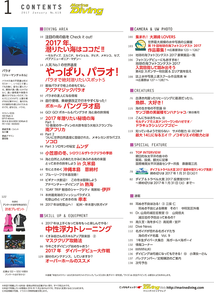 このほか、期間限定スポット解禁の熱海や、冬でもおもしろい恩納村ステイ、南房総のシャークシティ、伊戸や和歌山県にある本州最南端のフィッシュパラダイス串本などなど、注目のダイブエリアがズラリ。さらに、「ダイブ&トラベル大賞2017」の中間ランキング発表や人気の連載も見逃せない!