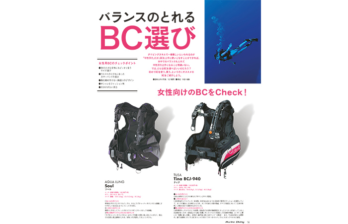 中性浮力をとるためにはBC選びも大切! ということで、今回は女性ダイバー向け、ビギナー向けのBCをセレクトして紹介。さらにモニターを1名募集! ぜひ本誌とじ込みのアンケートでご応募ください。