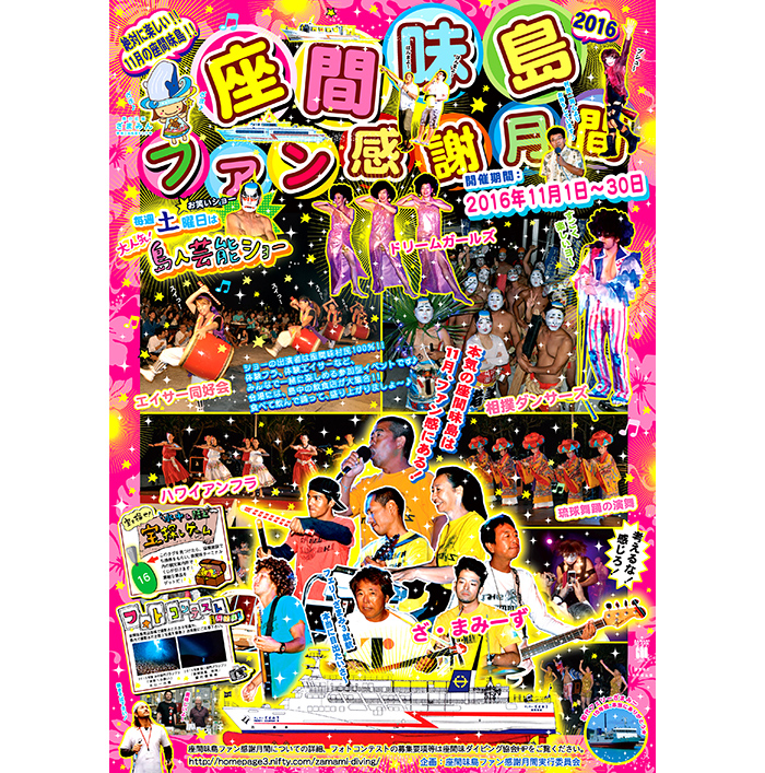 座間味島民の方々が11月の1カ月を丸々使って、座間味ファンの皆さまのためにおもてなしをしてくれるイベント。島人芸能ショーやフォトコンテストなどお楽しみプログラムが満載! 詳細は下記チラシをご覧ください。