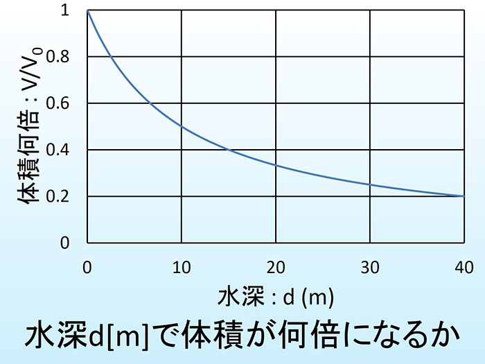 グラフの横軸は「水深」dを表し、0mから40mまでを表示しています。グラフの縦軸は「体積」が何倍になったかのV/V0を表し、0倍から1倍までを表示しています。そして、グラフの中の青く太い線が、それら2つの関係を示しています。その形は曲線、少し複雑な関係です。横軸の水深が0mの時は、縦軸の体積は1倍からスタートしていることもグラフから一目瞭然です。水深が深くなると、体積は右肩下がりで小さくなりますが、水深が浅いほど急で水深が深いほど緩やかであることもグラフから一目瞭然です。中学生の時に数学で反比例を習った記憶がある人もいるかもしれません。このグラフは反比例に近いですが、分母に+1があるので少し横にずれています。
