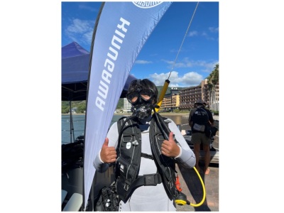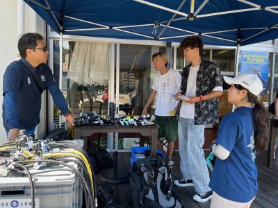 現地では、GULL、SCUBAPRO、シェアウォーター、Bism、 TUSA、 ATOMIC、 アクアラング、apeks、 MARES、apollo、(ワールドダイブ、モビーズ)と「マリンダイビングWeb」がブースやモニター品を出し、学生の皆さんがグループを作って各メーカーのブースを回って器材の説明を聞いたり、実際に目の前の海でモニターしたりと、各商品に興味津々の様子が見られました。