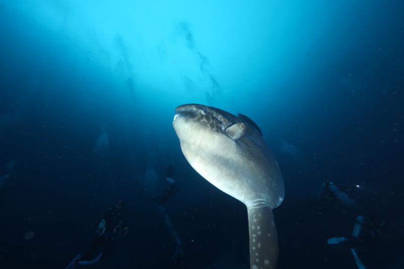 その日は潜るたびにマンボウに遭遇できたが、最も印象に残ったのは4本目のダイビングだった。水深-30m。澄んだ海の中、広い砂地のヘリで巨大なマンボウが5匹、クリーニングを受けている。もしこれが1本目だったなら、全員が一斉に、物凄い勢いで寄っていってしまったかもしれない。だが、「寄れば逃げる」ということを、この1日で私たちは学んでいた。
