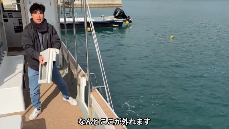そして大好評だというのが、ハシゴ周りの一工夫。取り外しできる「出入口」によって、海からボートへ戻る時、ハシゴを昇りきったあとにボートのふちをまたぐ必要がないのです! 体力的にはもちろん、外したフィンやカメラを船内に置くのも楽になりました。