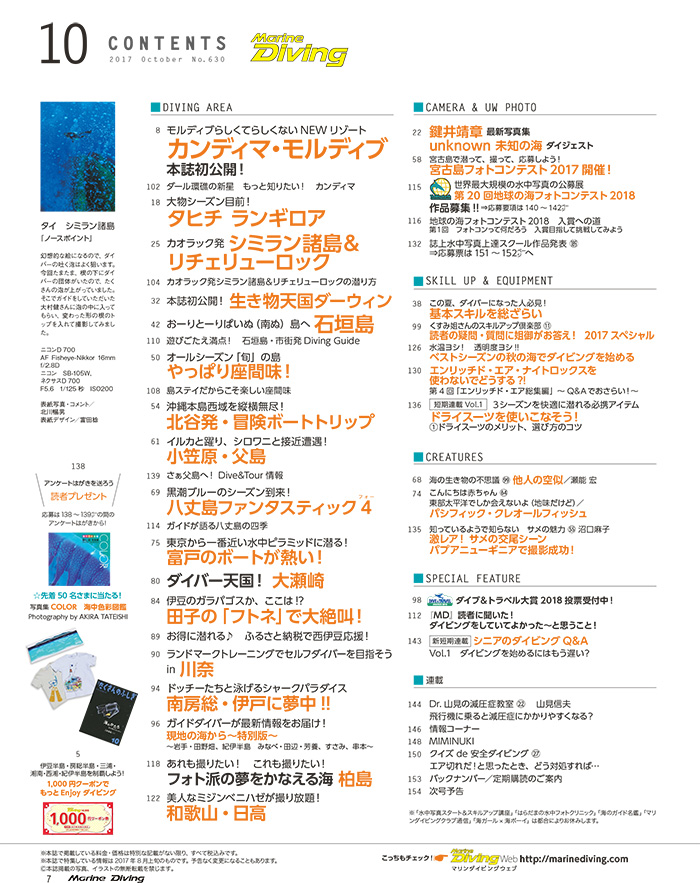 ほかにも小笠原、八丈島、タヒチ・ランギロアといった人気スポット特集や、川奈でランドマークトレーニングして一人前になる!特集、ビギナー必見!スキル総ざらい企画などなど、奥深く厚みのある一冊となっています。さらに、水中写真家・鍵井靖章さんの最新写真集『unknown』をいち早く見られるダイジェスト版も! こりゃ、ダイバーなら買わなくちゃ!!
