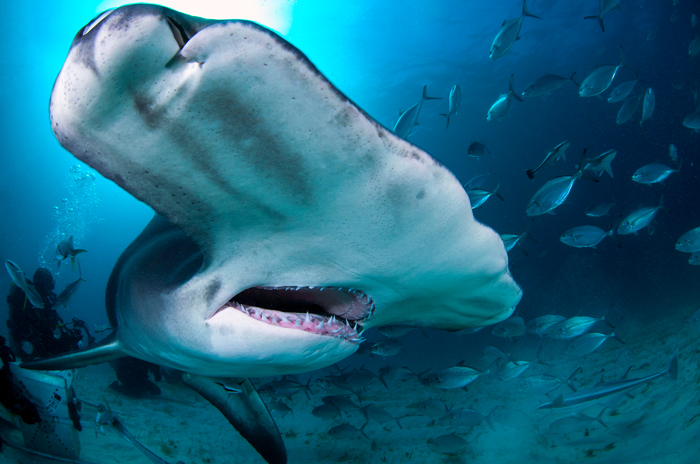 フィッシュアイで撮っていると思いますが、もう触れるくらいギリギリまで迫っていますね。ハンマーヘッドシャークは、出会っただけで「(遠くのシルエットだけど)すごかったね!」と感激する被写体なのですが、これは「歯並びはこんな感じなのね」なんてところまで見えちゃって、つい「ごめんなさい!」と謝っちゃいそうになるほど迫力があります。餌付けスポットだそうですが、それを加味したとしても構図に迫力はあるしライティングもうまいし、見る者の目を惹く強い写真です。