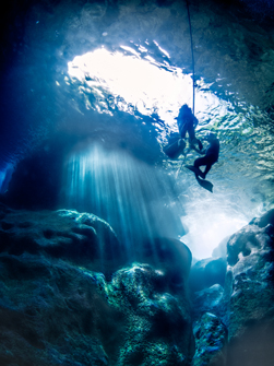光で照らされた岩、水面のきらめき、そしてダイバーをシルエットで絶妙の位置に配置した上で、これらを縦位置で撮ることで浮遊感や奥行きを強調しています。ケーブで撮影された作品は黒青白の強いトーンのものが多いようですが、この作品にはほとんど黒い部分がない。明るい光芒が印象的で新鮮です。